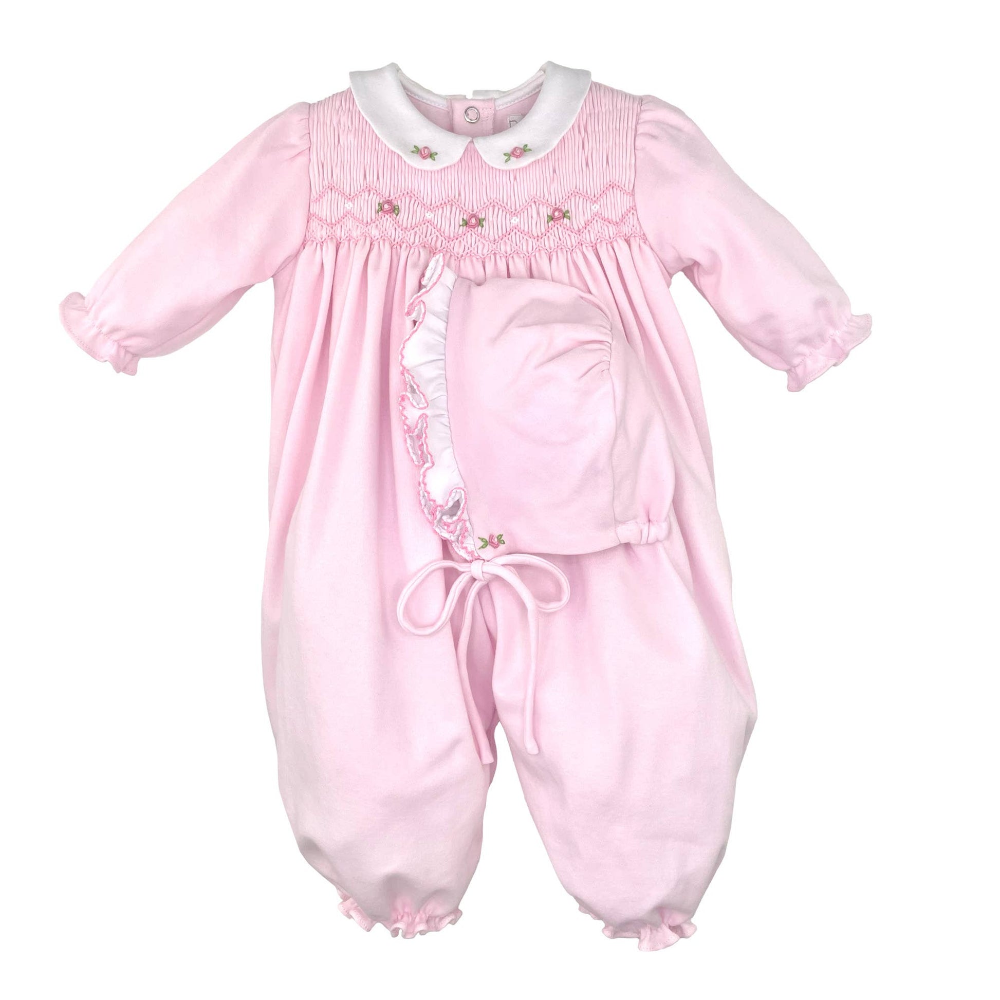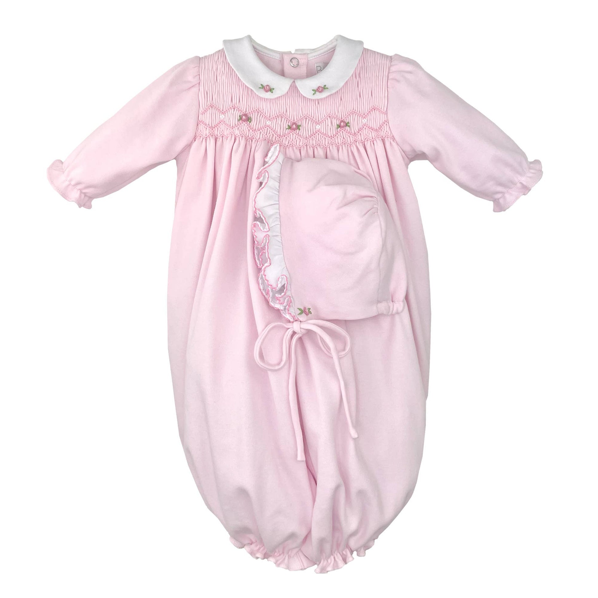 Featuring a delicate light pink interlock knit fabric with full smocking on the front making an outfit that is just simply sweet and perfect for wearing home from the hospital! This bag is designed to snap apart at the bottom to convert into a longall, giving you two outfits in one! A matching hat is also included.