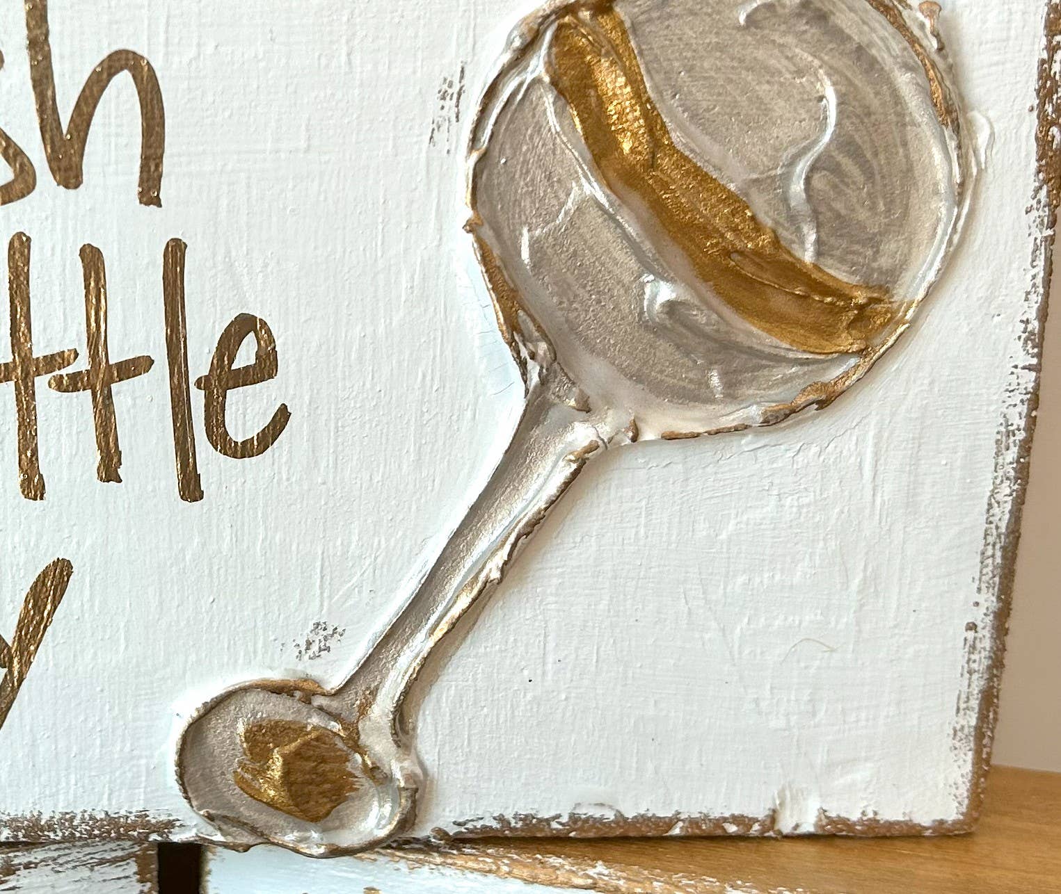 This thick 3x5 wood block is hand painted in a soft palette of blue, white, and yellow. Baby rattle is textured and embellished with gold and silver.