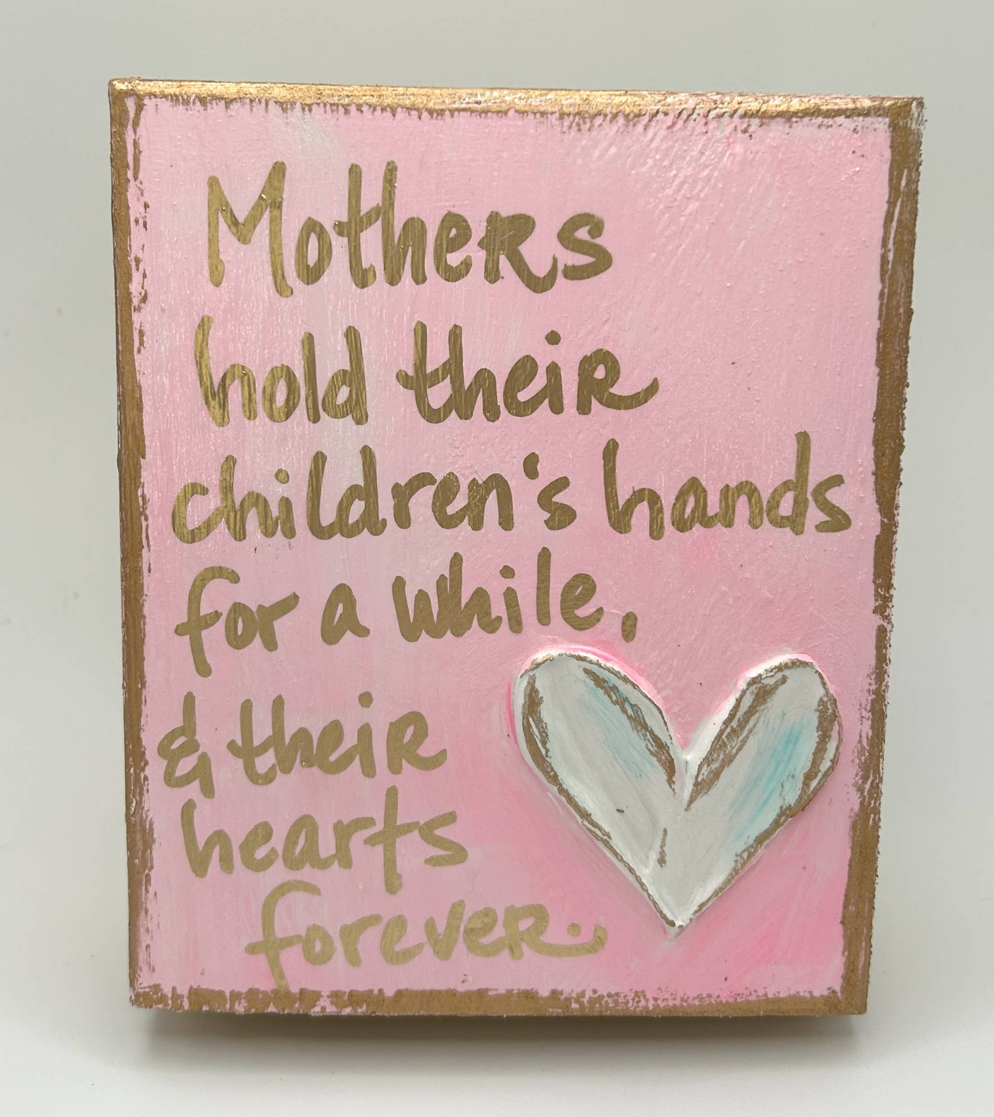 Choose from three different designs and color schemes. Blocks are thick and self-standing with gold edges, embellishments, and lettering. Designs are textured and hand painted with an overlay of pearl shimmer and gold trim.