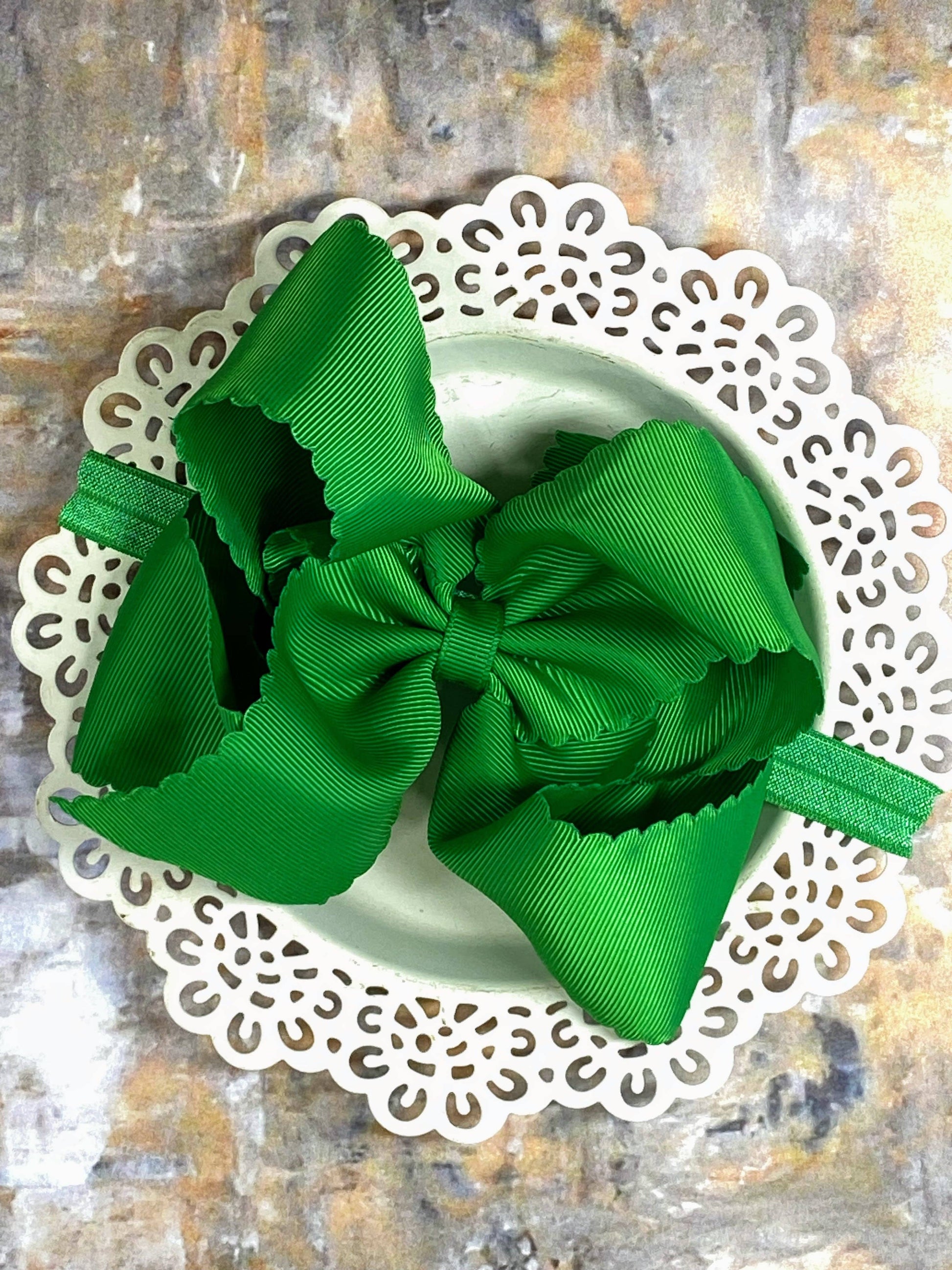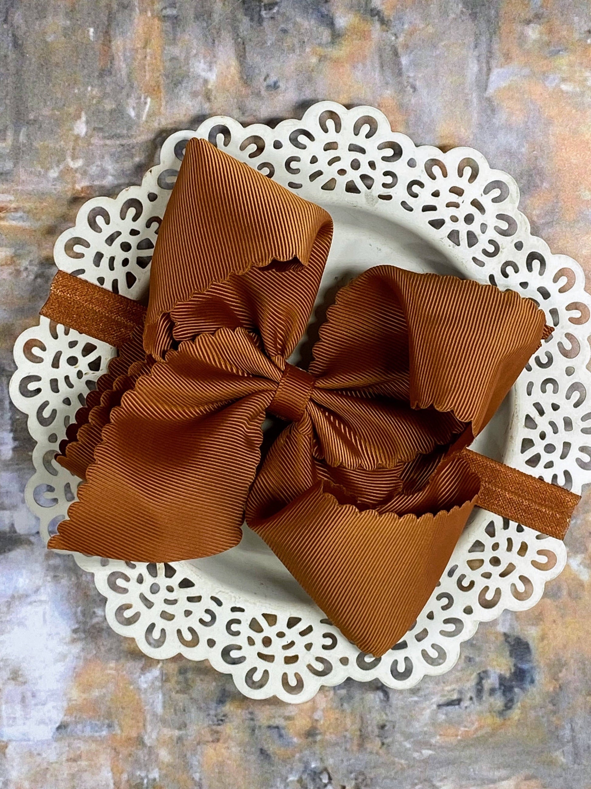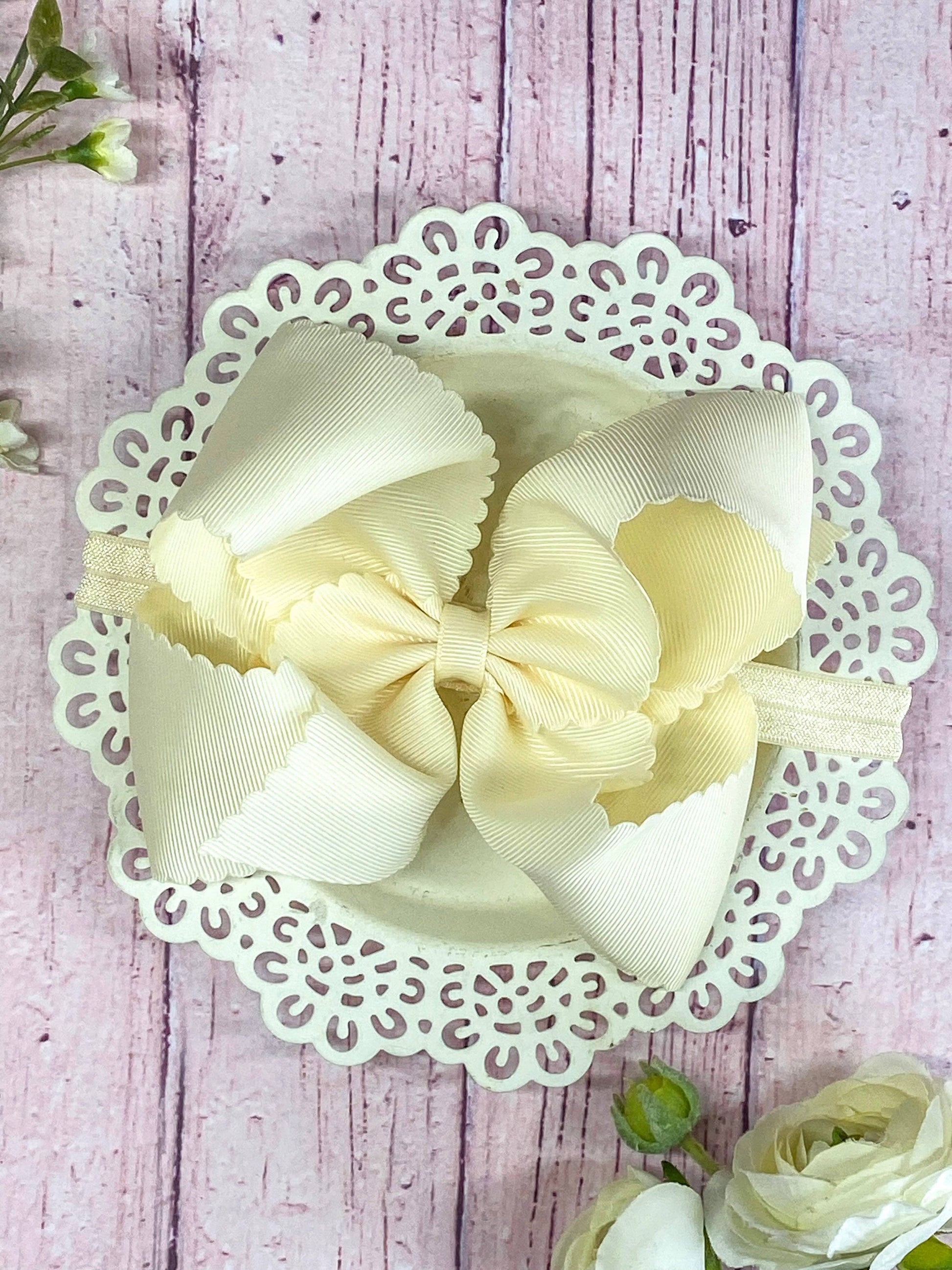One of our top selling baby headbands is now available in this larger size! This headband is truly exceptional. Its scalloped detailing and timeless bow size bring a whimsical element to any ensemble. As a comfortable and chic accessory, it is a necessary addition for any stylish individual. Prepare to make a statement and receive praise with this one-of-a-kind headband! One of our top selling baby headbands!