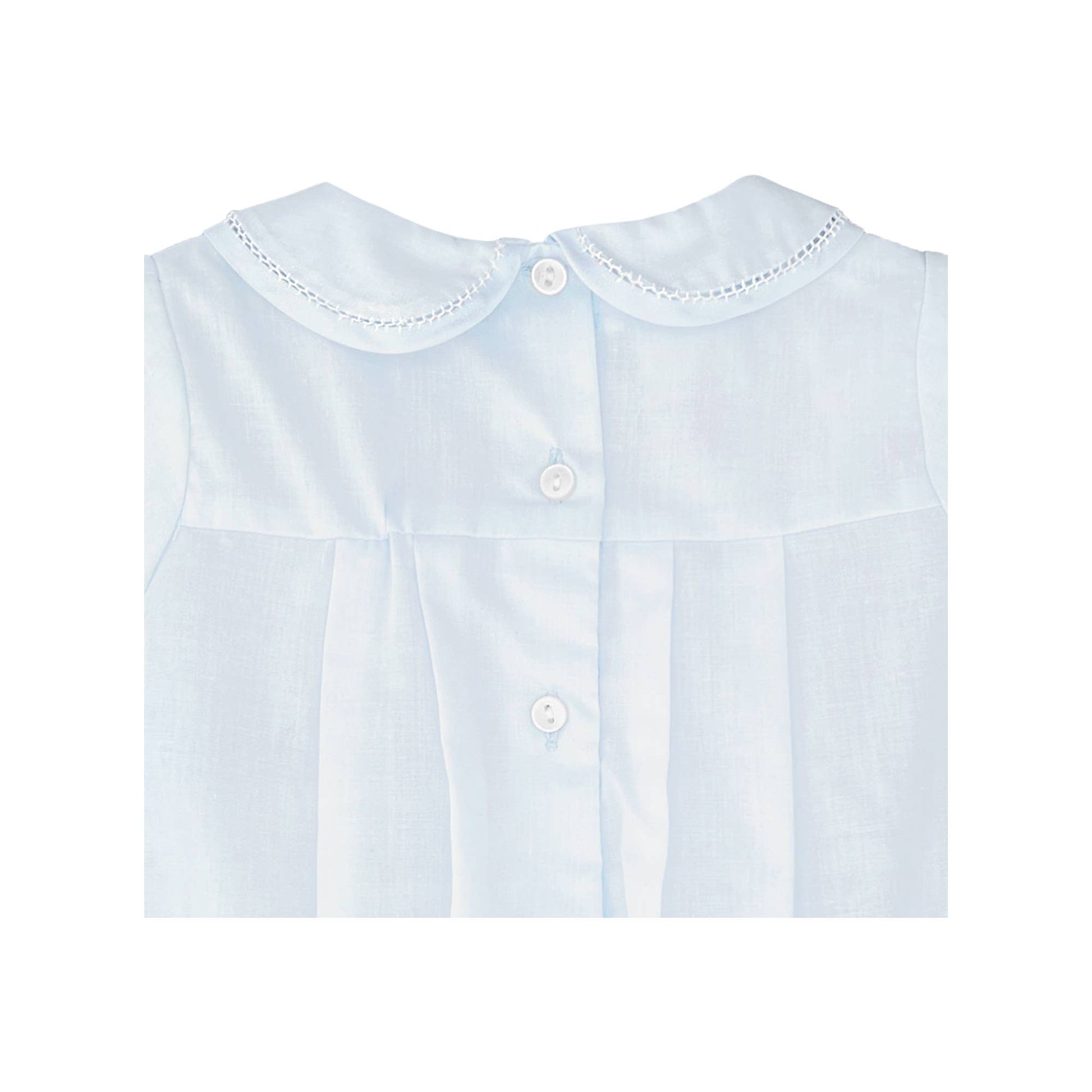 This piece is as sweet as if it were pulled out of your grandmother’s cedar chest and is sure to become a treasured keepsake. Featuring heirloom-quality handcrafted details like inverted pleats and hand-embroidered feather stitches.