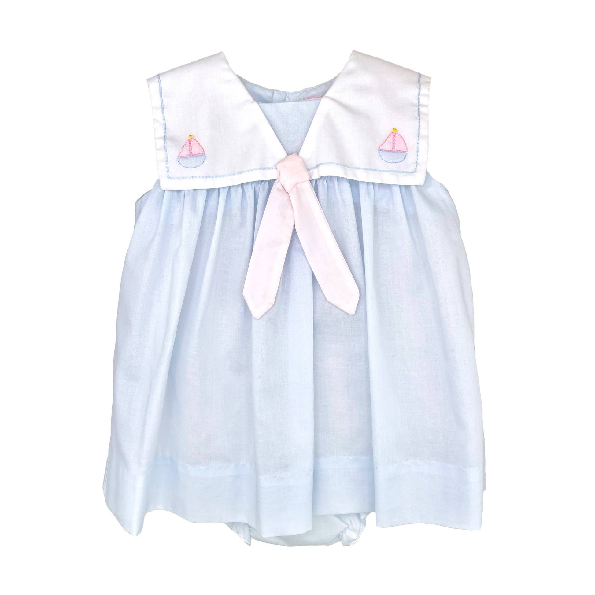 A fun and playful dress that is perfect for summertime with an embroidered sailboat and nautical style collar.